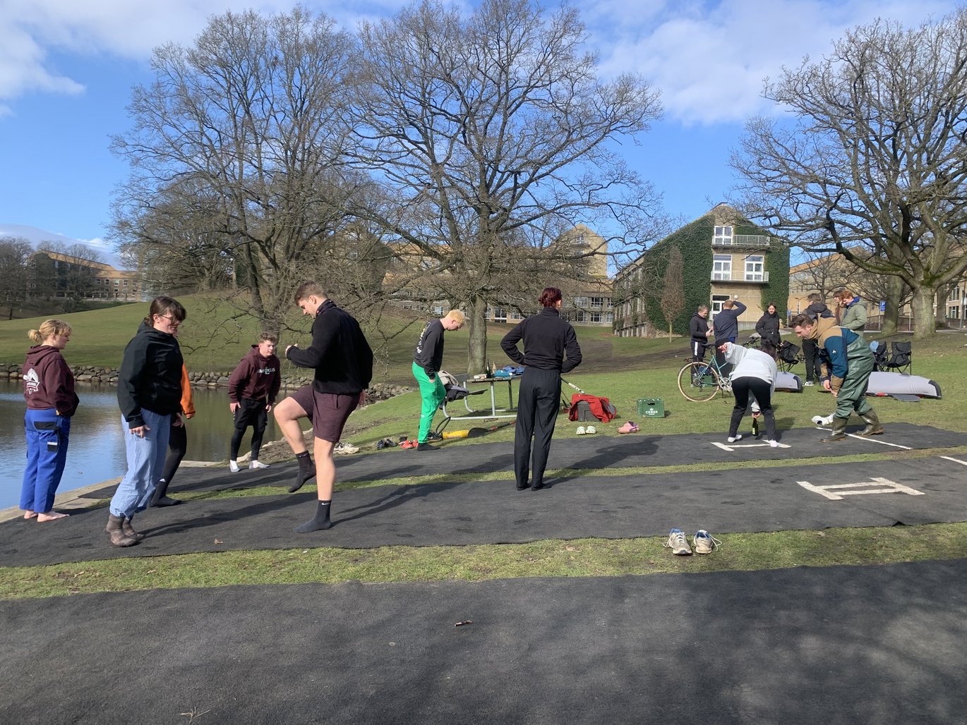 Omnibus møder de to arrangører af årets kapsejlads, Emil Ebbensgaard Kjær og Daniel Vestergaard, sammen med resten af medicinernes festforening, Umbilicus, nede ved den nordlige sø på årets første forårsdag. Her er de i færd med at træne deres såkaldt spinside ved søens bred.