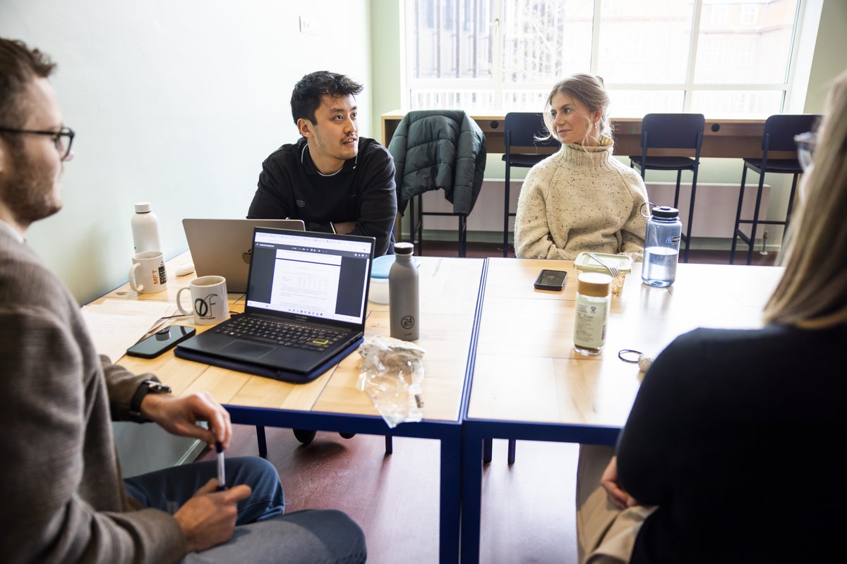 Inside, however, four Master’s thesis students are a little annoyed about having been moved from Fuglesangs Allé in the 10th semester of their programme. Not least because there was a whole corridor on Fuglesangs Allé reserved for Master’s thesis students. That’s not the case here. They have therefore gathered around a table in one of the common areas.